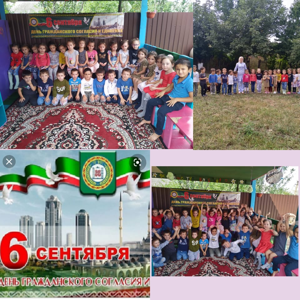 06.09.2019МБДОУ "Детский сад "Полянка" с.п. Комаровское Беседа на тему: "День гражданского согласия и единения". Один из самых важных дней в праздничном календаре Чеченской Республики - День гражданского согласия, единения и примирения, поскольку именно согласие и единство, являются важнейшими факторами становления и эффективного развития гражданского общества. Указ о праздновании Дня республики был подписан в 2002 году Главой Администрации ЧР, а в последующем и Первым Президентом ЧР, Героем России Ахмат-Хаджи Кадыровым